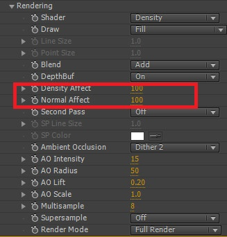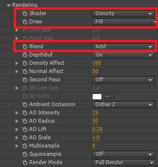 16. 전체 렌더링을 결정하는 Rendering 옵션으로 가서 Shader를 Flat에서 Density로 바꿔줍니다. 컴포지션 윈도우를 보면 전체적으로 상당히 오브제가 어두워졌음을 알 수 있습니다.