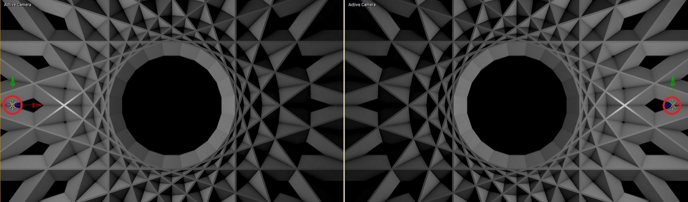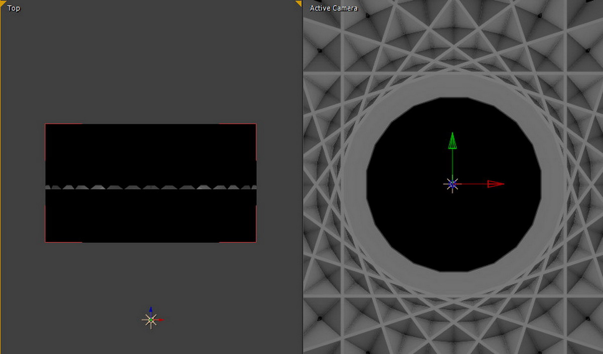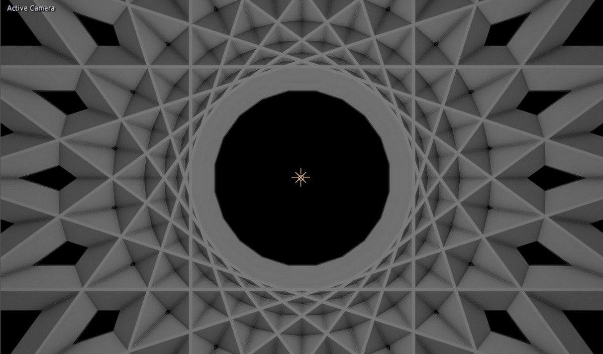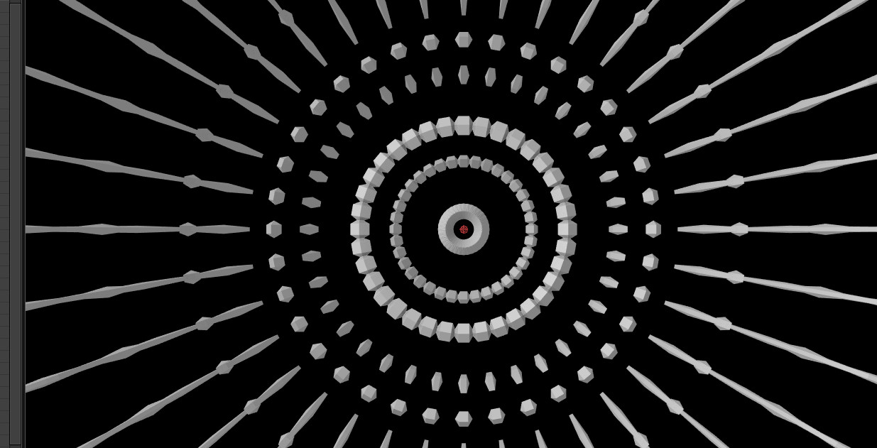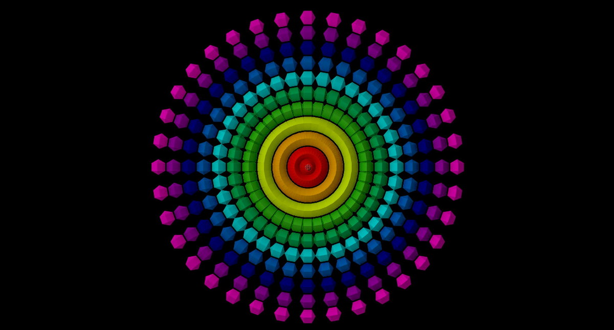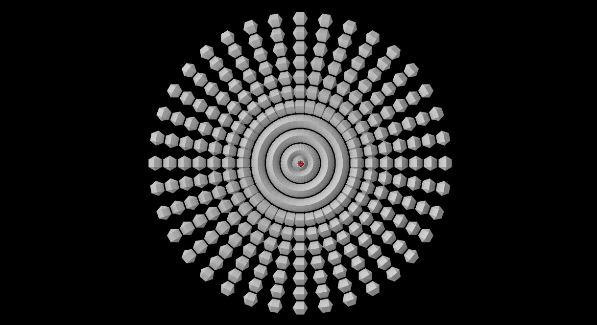 02. Repeater는 총 2개로 구성되어 있습니다. Second Repeater에 있는 R2 Repeations을 5개로 설정하고, Size 및 Position X 값을 조절해줍니다. 아래와 같이 방사형의 복잡한 구조물이 만들어졌습니다. 복잡한 구조물은 하나의 R1과 다섯 개의 R5로 이루어진 조형물입니다(만약 여기에 또 다른 여러 개의 TAO를 만들어서 삽입한다면 좀 더 복잡한 구조를 만들 수 있습니다).