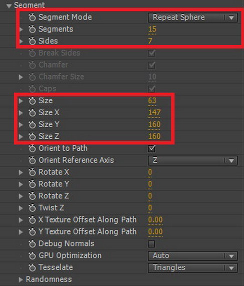 05. 앞서 Repeat Paths에 Texture를 적용했다면, 이번에는 하나의 오브제에 Texture를 적용해 보겠습니다. Line으로 설정을 하고, Segment Mode를 Repeat Sphere로 설정합니다. 사이즈를 그림처럼 입력합니다.