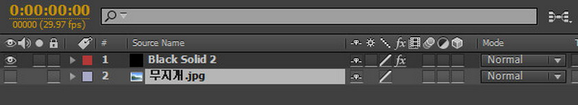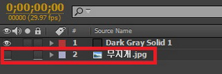 09. 앞서 작업한 것과 동일하게 무지개.jpg 파일을 타임라인 상에 올려 놓습니다. 그런 다음에 레이어 눈을 끕니다. 레이어 눈을 끄는 것은 컴포지션 윈도우상에서는 보이지 않고, 다른 이펙트에서 불러들여 사용하기 위해서 입니다.