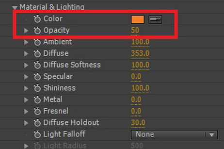 15. 오브제의 질감 및 빛을 조절하는 Material & Lighting에서 Color를 오렌지로 설정하고, 오브제의 투명도를 50%로 설정합니다.
