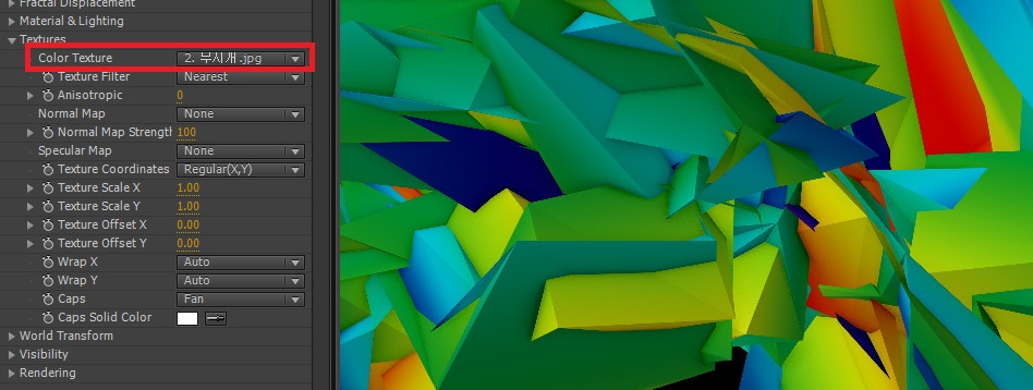 10. TAO 이펙트의 Textures 옵션에서 Color Texture 팝업 메뉴의 '무지개.jpg' 레이어를 선택합니다. 선택함과 동시에 전체 오브제가 맵핑되는 것을 볼 수 있습니다. 현재는 각각의 폴리곤들이 완전히 뒤틀린 상태에서 보는 것처럼 다양한 컬러가 랜덤하게 입혀진 것처럼 보여집니다. 만약에 2개 내지는 3개의 컬러를 적용한다면 느낌은 또 달라질 것입니다.