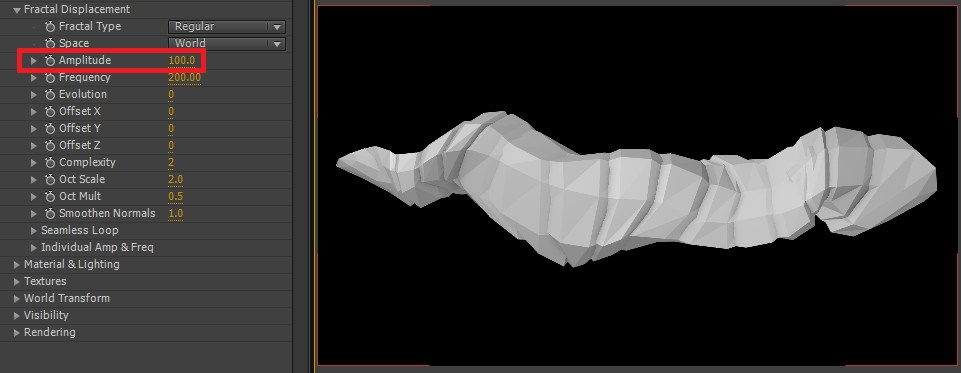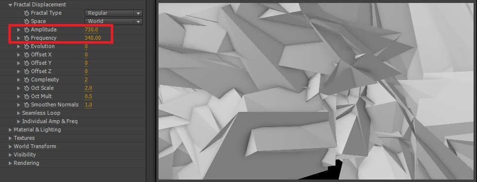 08. Amplitude와 Frequency 값을 올려주면, 폴리곤들이 세분화되면서 어긋나 보이게 됩니다. 마치 부서진 조각들의 모임처럼 보여집니다. 이와 같은 방식은 3D 프로그램에서도 종종 사용되는 기능 중 하나입니다.
