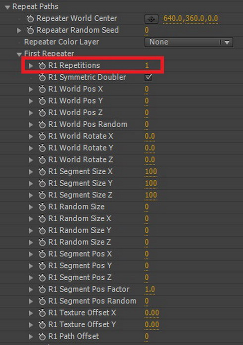 01. 이번에는 복잡한 작업을 단순하게 만들 수 있는 Repeat Paths의 기능에 대해 알아보겠습니다. Cinema4D의 Mograph 기능처럼 TAO 이펙트에 있는 Repeat Paths 기능은 강력합니다. 먼저, First Repeater에 있는 R1 Repeations을 1로 설정합니다.
