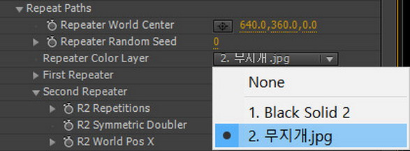 03. Repeat Paths 옵션 중에 Repeater Color Layer라는 옵션이 있습니다. 팝업 메뉴에서 앞서 타임라인에 올려놓은 '무지개.jpg'를 선택합니다.