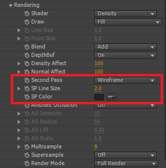 19. TAO 이펙트가 괜찮은 이유 중 하나는 옵션이 생각보다 상당히 다양하다는 점에 있습니다. 렌더링 같은 경우도 Second Pass가 있어서 스타일을 조금 다르게 꾸밀 수 있습니다. Second Pass에서 Wireframe을 선택합니다. SP Line Size를 2로 설정하고, 컬러는 어둡게 설정합니다. 어둡게 설정하여도 현재 Blend가 Add로 되어 있어서 보는 바와 같이 라인의 컬러가 밝게 보여집니다.
